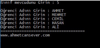 1 2 3 4 5 6 7 8 9 10 11 12 13 14 15 16 17 | int mevcut=0; Console.Write("Sınıf mevcudunu Girin : "); mevcut = Convert.ToInt32(Console.ReadLine()); Console.WriteLine(); string[] ogrenci = new string[mevcut]; for(int i=0;i<mevcut;i++) { Console.Write("Öğrenci Adını Girin : "); ogrenci[i]=Console.ReadLine(); } Console.WriteLine("===================================="); Console.WriteLine("www.yazilimkodlama.com"); Console.ReadKey(); |