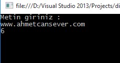 1 2 3 4 5 6 7 8 9 10 11 12 13 14 15 16 17 18 19 20 21 22 23 24 25 26 27 28 | static void Main(string[] args) { string kelime = ""; int sonuc = 0; Console.WriteLine("Metni Giriniz"); string cumle = Console.ReadLine(); Console.WriteLine("Kelimeyi giriniz"); string sozcuk = Console.ReadLine(); for (int i = 0; i < cumle.Length; i++) { if (cumle[i] != ' ') { kelime = kelime + cumle[i]; } else { if (kelime == sozcuk) { sonuc++; } kelime = ""; } } Console.WriteLine("Sonuc:", sonuc.ToString()); Console.ReadKey(); } |