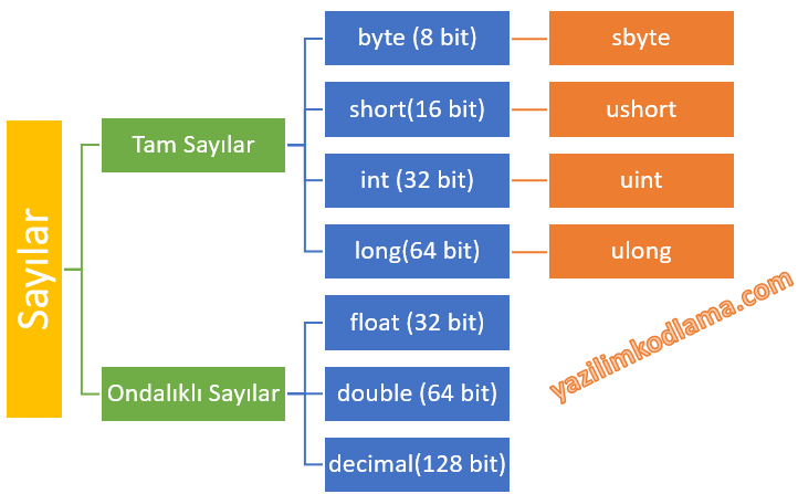 Aşağıdaki şekil, C#’daki sayısal türleri göstermektedir.