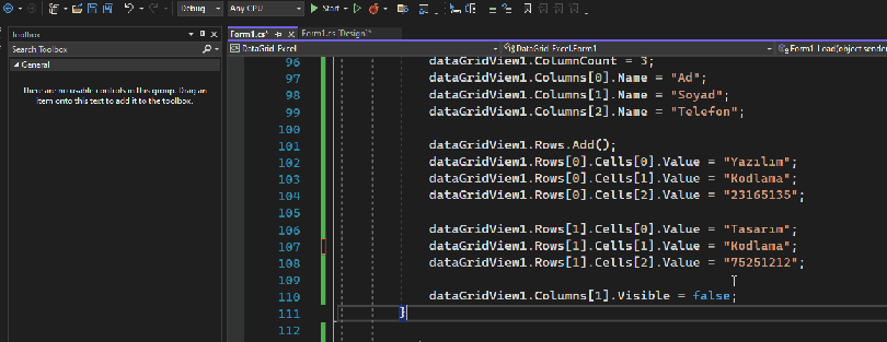 1 2 3 4 5 6 7 8 9 10 11 12 13 14 15 16 17 18 | private void Form1_Load(object sender, EventArgs e) { dataGridView1.ColumnCount = 3; dataGridView1.Columns[0].Name = "Ad"; dataGridView1.Columns[1].Name = "Soyad"; dataGridView1.Columns[2].Name = "Telefon"; dataGridView1.Rows.Add(); dataGridView1.Rows[0].Cells[0].Value = "Yazılım"; dataGridView1.Rows[0].Cells[1].Value = "Kodlama"; dataGridView1.Rows[0].Cells[2].Value = "23165135"; dataGridView1.Rows[1].Cells[0].Value = "Tasarım"; dataGridView1.Rows[1].Cells[1].Value = "Kodlama"; dataGridView1.Rows[1].Cells[2].Value = "75251212"; } |