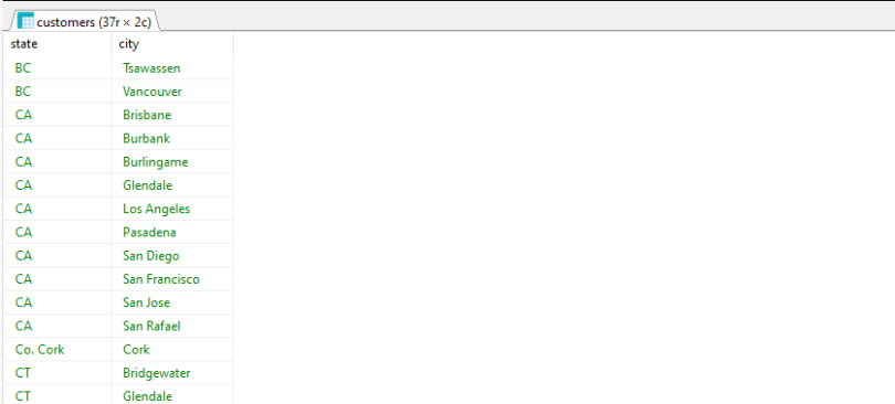 1 2 3 4 5 6 7 8 9 10 11 | SELECT DISTINCT state, city FROM customers WHERE state IS NOT NULL ORDER BY state, city; |