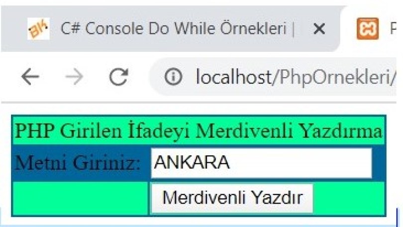 Bu örneğimizde kullanıcının klavyeden girmiş olduğu bir metni baştan başlayarak merdiven şeklinde yazdıran php kodlarını yazacağız.