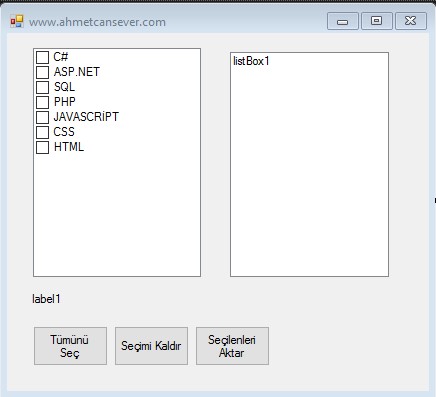 Son olark Seçilenleri Aktar butonuna geçiyoruz. Burada CheckedListbox kontrolünde işaretli olan elemanların ListBox’ a aktarılmasını sağlayacağız. Kodlarımız aşağıdaki gibi olacaktır.