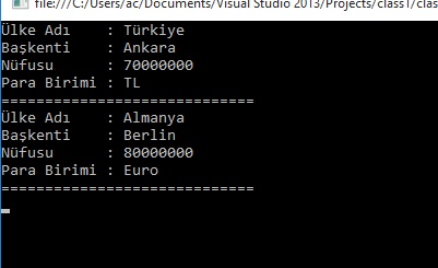 Bu örneğimizde ise ulke isimli bir sınıf oluşturacağız. ulke sınıfının özelliklerini adı, başkenti, nüfusu ve para birimi olarak ayarlayacağız. Bu sınıfa ait metotta ise bu bilgilerin yazdırılmasını sağlayan Yazdir isimli bir metot oluşturacağız.