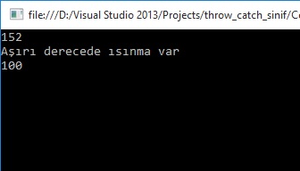Programımızı çalıştırdığımızda ısı değerini 152 olarak girdiğimizde 100′ e set edildiğini ve fırlatılan hata mesajının yakalandığını göreceğiz.