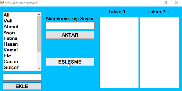 Şimdi de eşleşme kurası için gereken kodlarımıza bakalım. Örnek olarak sınıflar arası bir yarışma ya da herhangi bir yarışmada rastgele eşleşme yapmak amacıyla bu kodlar kullanılabilir. EŞLEŞME butonuna basıldığı zaman listbox1 içindeki kişilerin eşit bir şekilde ListBox2 ve ListBox3 içine rastgele dağıtılmasını sağlayan kodlarımız ve çalışması aşağıdaki gibi olacaktır.