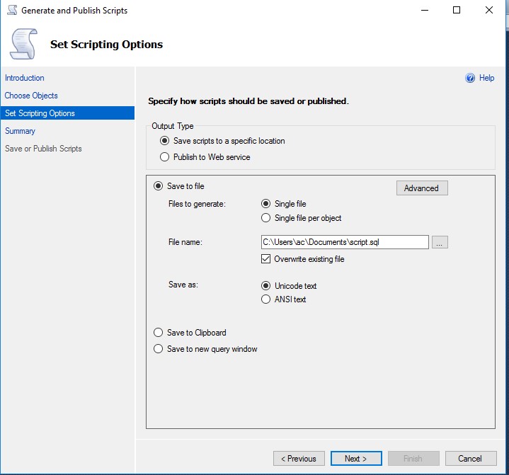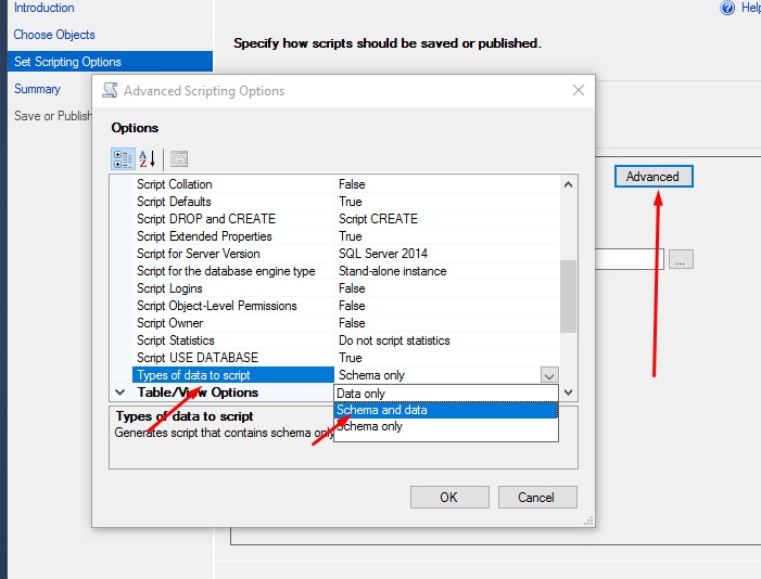 Bu adımdan sonra karşınıza alttaki ekran gelecektir. Burada iki ayar yapacağız. İlk olarak Advanced butonuna tıklayın. Gelen Advanced Scripting Options penceresinde Types of data to script bölümünü Schema and data olarak ayarlayın.