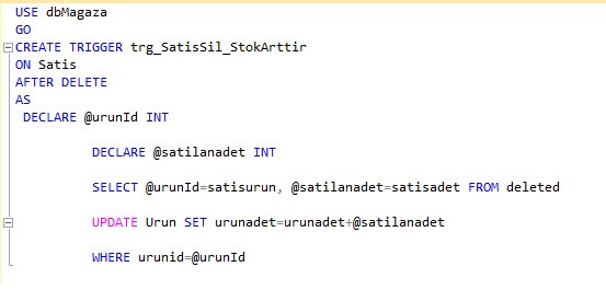 Satış tablosuna bir değer girildiğinde Urun tablosundaki stok adetinin azaldığını görmüş olduk. Peki bu satıştan vazgeçilirse yani Satis tablosundan bir kayıt silinirse ne olacak? Bu iş için ise imdadımıza Delete Trigger yetişiyor. Satış tablosundan herhangi bir kayıt silinirse Urun tablosunda Stok adetinin yani urunadet alanının silinen kayıttaki adet kadar arttırılmasını sağlayalım.